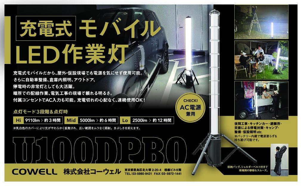 お知らせ 新発売 新商品発売のお知らせ:バッテリー式作業灯 U100DPBO 日頃よりご愛顧いただき、誠にありがとうございます。 この度、弊社の新製品 「バッテリー式作業灯 U100DPBO(商品コ... 詳細はこちら